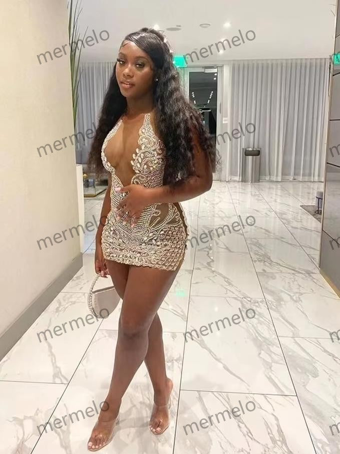 Unique Gold Leather Prom Dress with Heavy Beads Sexy Deep V Neck Full Crystals Chic Evening Party Dresses Short Prom Gowns