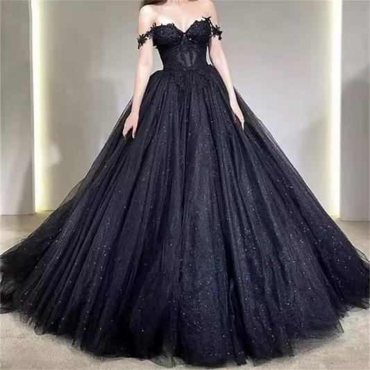 Black Shiny Quinceanera Dresses Applique Lace Tulle Beading Off The Shoulder Party Dress Lace Up Court Train Prom Ball Gown