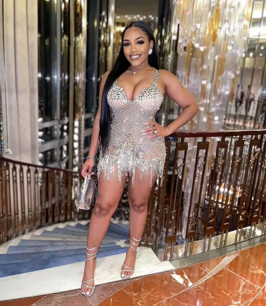Silver Diamond Mini Cocktail Evening Dresses for Women 2024 Sparkly Luxury Crystal Tassel Black Girl Birthday Gala Prom Gown