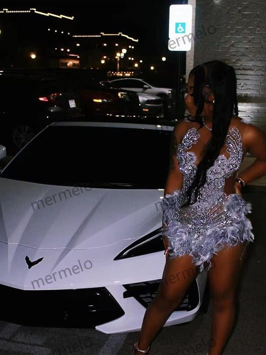 Silver Diamonds Short Prom Dress Glitter Crystals Beads Feathers