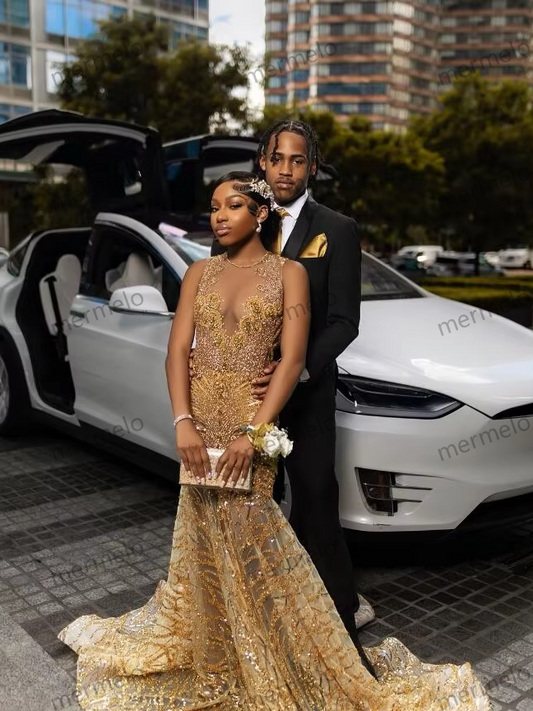 Sparkly Gold Diamonds Prom Dress For Black Girl Beaded Crystal Rhinestones Birthday Party Dresses Side Train Cocktail Gown