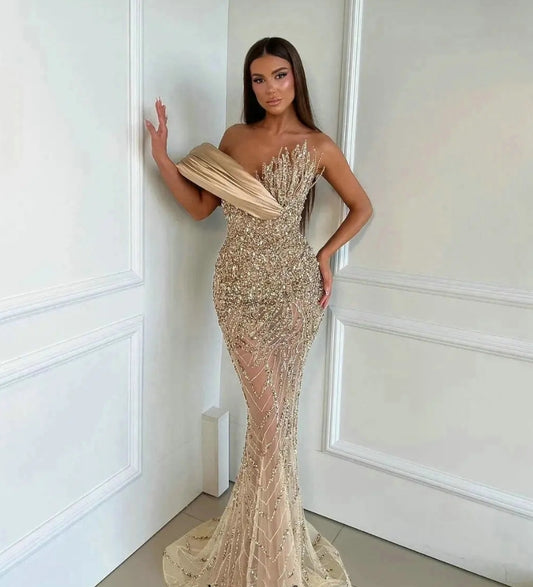 Champagne Long Sequins Evening Dresses One Shoulder Handmade Beaded Vestidos De Noche Sexy Sleeveless Party Gowns for Women