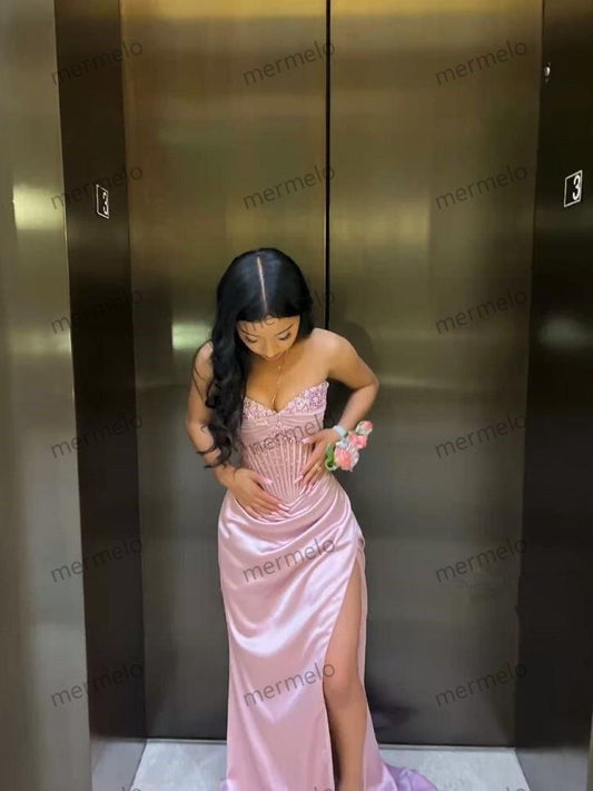 Elegant Sheath Sweetheart Sequin Pink Satin Slit Prom Dresses Evening Dress