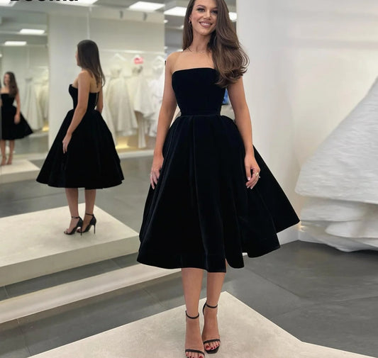 Elegant Velvet Short Little Black Dresses Strapless Tea-Length A-Line Prom Gowns Simple Velour Midi Party Dresses