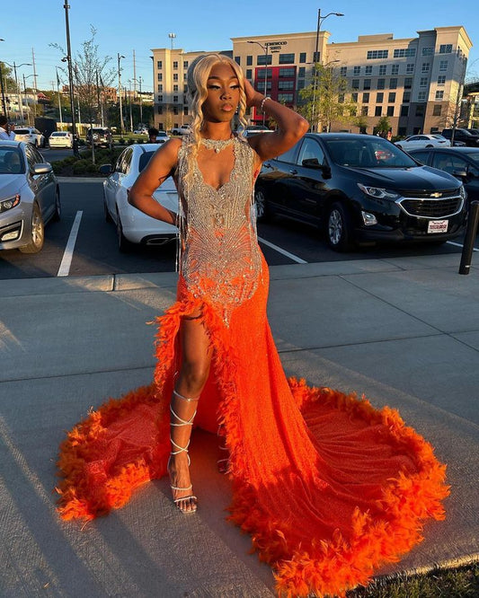 Emerald Green Sparkly Long Evening Ceremony Dresses for Black Girl Luxury Diamond Feather Sheer Prom Birthday Party Dress