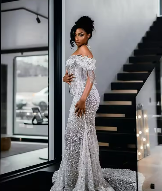 African prom dress, ball dress, luxury silver mermaid prom dress, bridesmaid gown, evening gown, birthday photoshoot gown, dinner party gown
