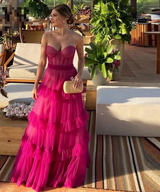 Fuchsia Woman Prom Dresses Tiered Tulle Sweetheart Engagement Evening Dresses Guest Wedding Party