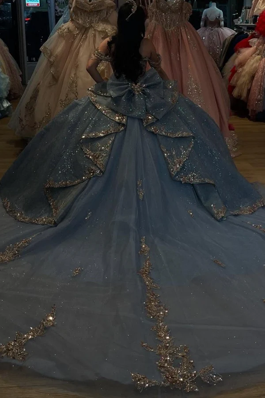 Off Shoulder Sleeveless Beaded Aooliques Bow Knot Blue Quinceañera Dresses for Sweet 16