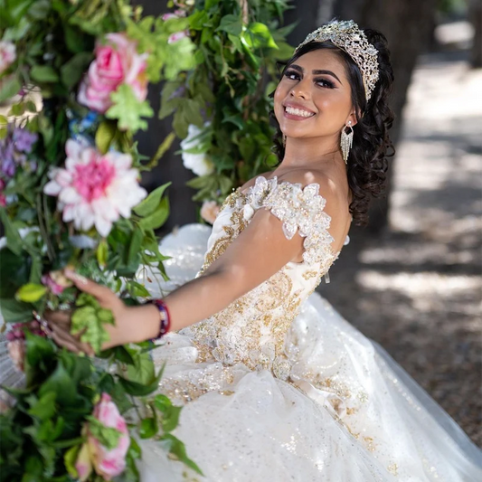 Sexy Off Shoulder Ball Gown Quinceanera Dress 2024 Tulle Gold Appliques Lace Sweet 15 16 Years Birthday Party Formal