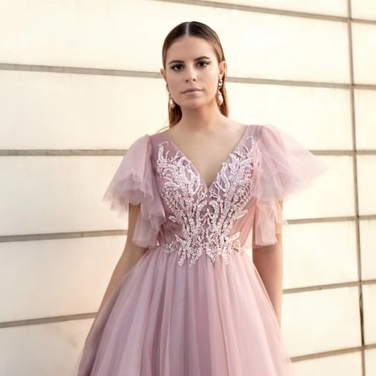 Tulle V-neck Luxury Prom Dresses Ruffles Short Sleeve Sequins Appliques Quinceanera Dress Elegant Backless Ruched Party Gowns