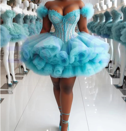 Ice Blue Lace Ball Gown Tulle African Prom Dress 2024 Aso Ebi Black Girl Luxury Cute Wedding Dress Birthday Party Formal Gown