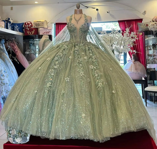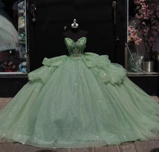 Sparkling Sage Green Lace Up Ball Gown Quinceanera Dresses 2025 With Appliques Mexico Brithday Party Vestidos De 15 Quinceañera