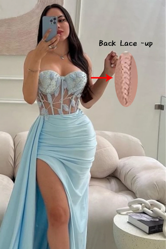 Satin Sweetheart Mermaid Prom Dresses With Split Sheer Corset Lace Appliques Formal Evening Party Sleeveless Long Ball Gowns