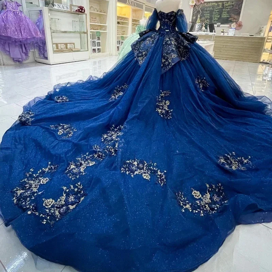 Exquisite Navy Gown Quinceanera Dresses Appliques Flower Beaded Off Shouler vestidos de fiesta Women Simple Formal Party vestido