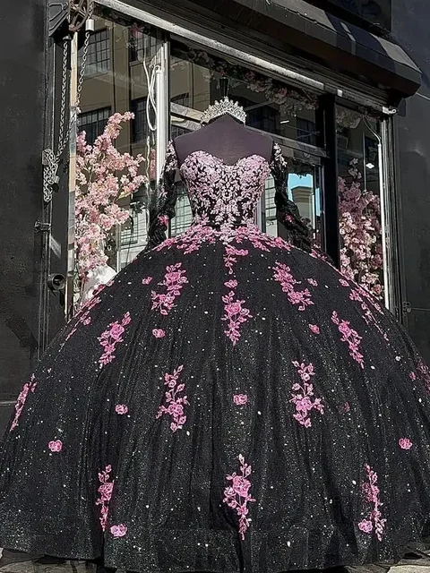 Black Sweetheart Ball Gown Quinceanera Dresses Glitter Tulle Applique Lace 15 Party Pageant Birthday Party Gowns Corset Back