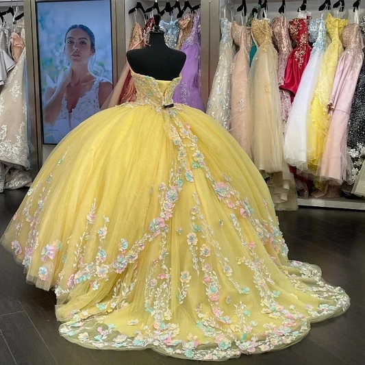 Shiny Yellow Lace-up Quinceanera Dress 3D Floral Applique Beading Ball Gown Off The Shoulder Tull Mexico Sweet 16 Vestidos De X