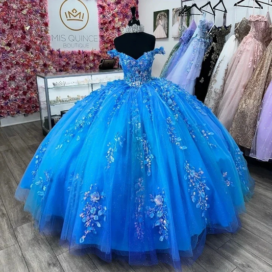 Gillter Blue Elegant Ball Gown Sequined Appliques Beading Crystal Quinceanera Dresses Off The Shoulder Corset Vestidos De 15 Año