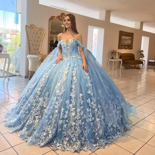 Glittering Light Blue Butterfly Quinceanera Dresses Off-Shoulder Luxury Lace Vestidos De 15 Anos Birthday Party