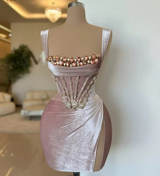 Velvet Pink Rhinestones Corset Short Cocktail Dress Spaghetti Straps Sleeveless Crystal Mini Prom Birthday Party Homecoming Robe
