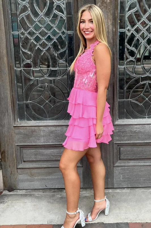 Cute A Line V Neck Hot Pink Chiffon Short Homecoming Dresses with Appliques