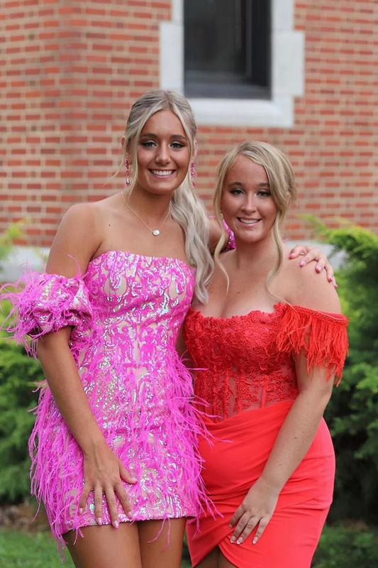 Cute Bodycon Strapless Hot Pink Sequins Homecoming Dresses with Feather