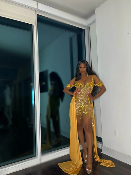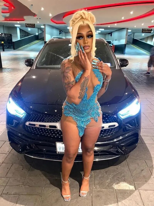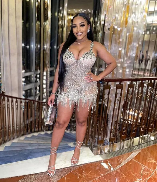 Sparkly Mini Evening Cocktail Dress with Side Train Luxury Crystal Sheer Mesh Birthday Slay Prom Gown vestidos de graduación