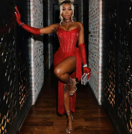 Sexy Red Short Prom Dress For Black Girls Lace Birthday Party Gowns With Gloves Mini Cocktail Homecoming