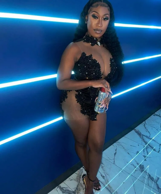 Sheer Mesh Black Girl Birthday Cocktail Dress Sexy Sparkly Crystal Applique Reception Prom Party Gown