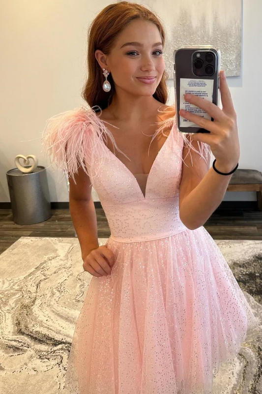 A-Line V Neck Straps Feather Tulle Homecoming Dress