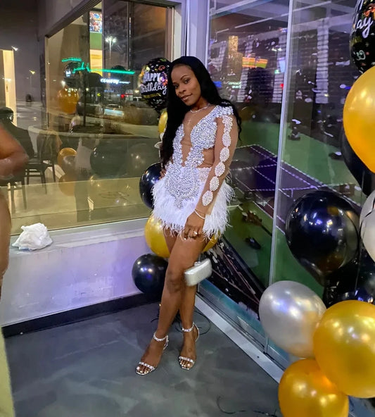 Sheer Beaded White Feather Long Sleeve African Cocktail Dresses Black Girls Short Prom Dresses Birthday Party Gowns Homecoming