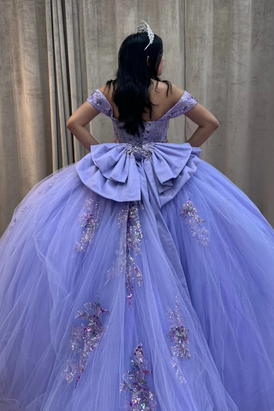 Off Shoulder Sleeveless Beaded Sequins Appliques Bow Knot Lilac Sweet 15 Quinceañera Dress