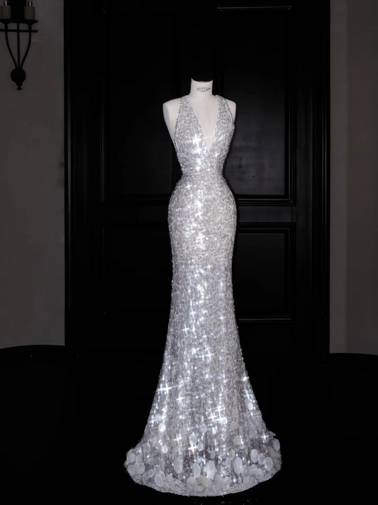 Sparkly Mermaid V Neck Silver Sequin Long Prom Dress Party Dress Graduation Dresses