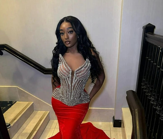 Red Velvet V Neck Long Prom Dress For Black Girls Beaded Birthday Party Dresses Mermaid Evening Gowns Robe De Bal