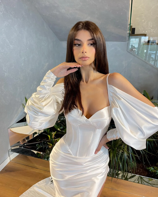 Elegant White Sexy Split Pleats Mermaid Evening Dresses Sweetheart Long Sleeves Formal Long special occasion Party Prom Dress