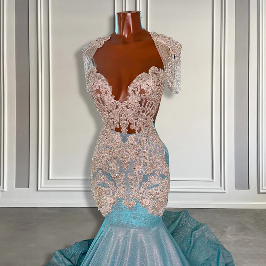 Glitter Sky Blue Mermaid Prom Dresses with Tassel Luxury Crystals Appliques Long Prom Party Gowns for Black Girls