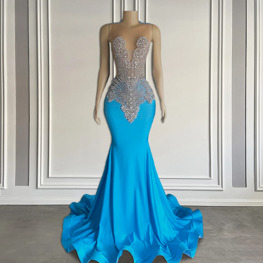 Elegant Blue Long Prom Dresses Luxury Crystal Beaded Mermaid Style Black Girls Prom Gala Gowns