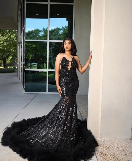 Sparkly African Trumpet Evening Formal Dresses Luxury Diamond Sequins Tassel Ruffles Black Girl Prom Slay Gown for Women