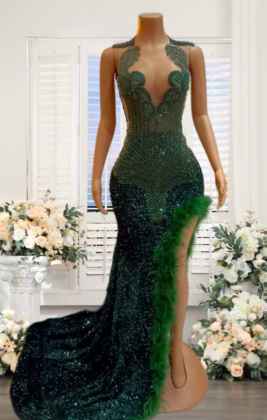Emerald Green Sparkly African Prom Dresses for Women Luxury Diamond Crystal Feather Slit Evening Birthday Gala Gown Black Girl
