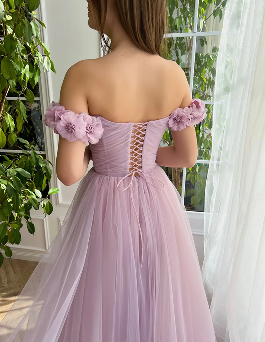 Elegant 3D Flower Dress Princess A-line Evening Dresses Sweet Side Split Vestidos De Noche Tulle Train Prom Dress