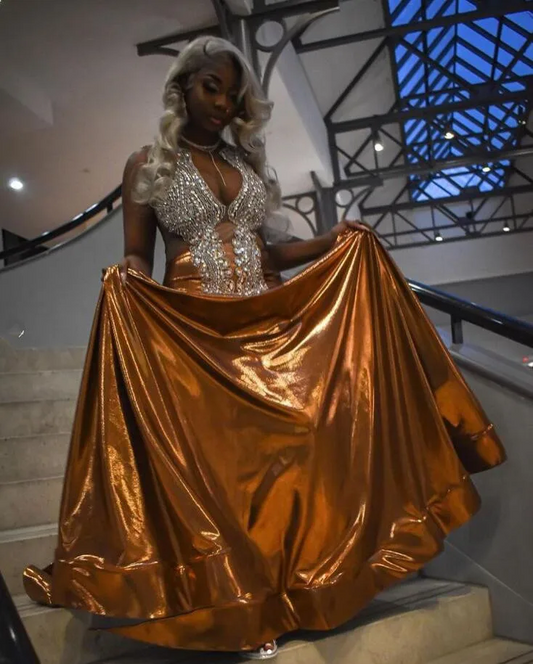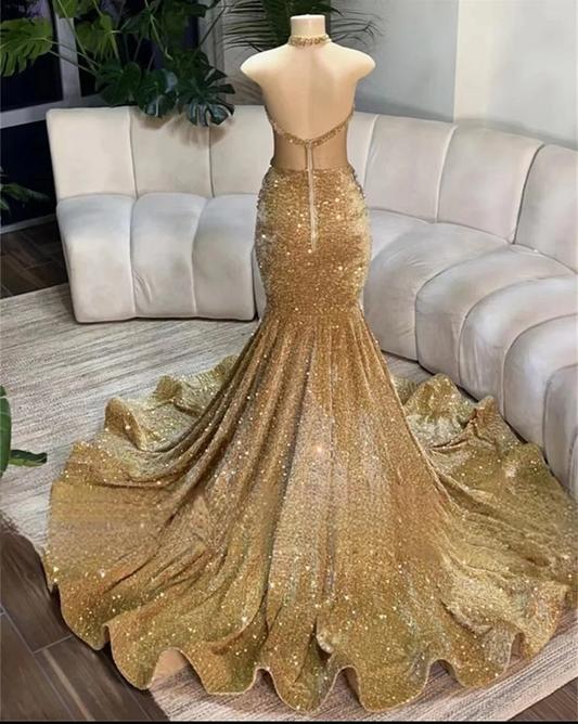 Sexy Gold Prom Dresses Halter Neck Sequin Party Gowns Vestidos De Gala African Women Evening Dress