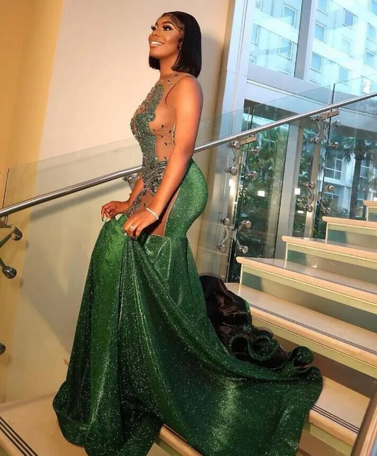 Emerald Green Mermaid Black Girl Evening Dress for Women Diamond Crystal Sheer Mesh Prom Birthday Gala Gown