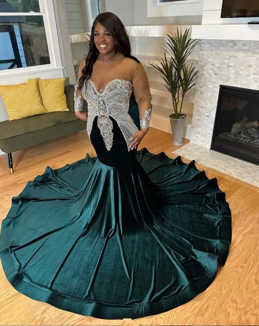 Hunter Green Velvet African Prom Dress for Women Big Size Crystal Applique Black Girl Birthday Gown فستان حفلات الزفاف