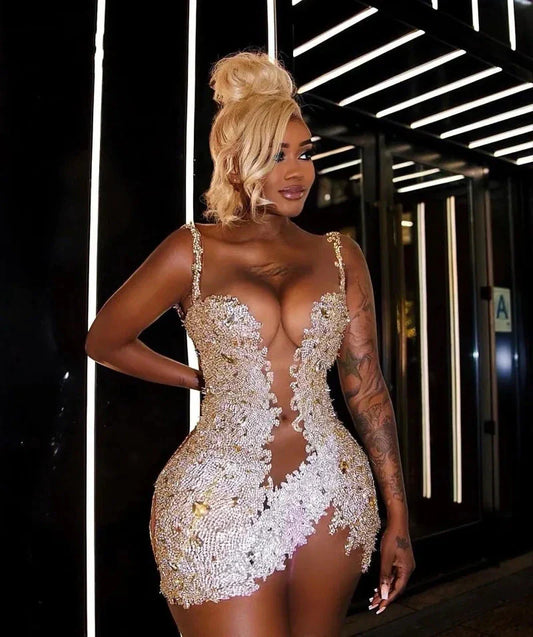 Sexy Sheer O Neck Short Prom Dress For Black Girls Beaded Crystal Birthday Party Gowns Mermaid Mini Cocktail Gown Robe De