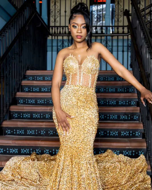 Gold Sparkly Sequin Mermaid Prom Dresses Long for Women 2025 Sweetheart Neckline Beading Illusion Corset Formal Evening Gowns