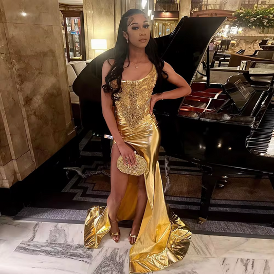 One Shoulder Golden Appliques Satin Dress With Slit Floor Length Elegang Mermaid Dresses Custom Made Women Clothing Free Shippin