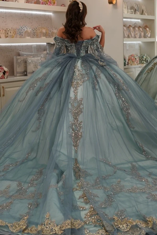 Off Shoulder Sleeveless Beaded Gold Appliques Blue Quinceañera Dresses