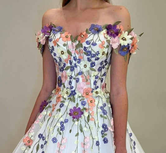 Off The Shoulder Wedding Dress Flower Lace Evening Dress White Corset Back Prom Dress With Appliques