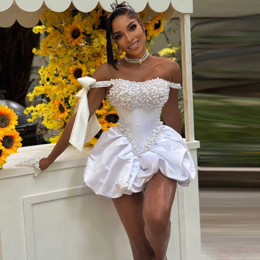Luxury Pearls White Mini Dress Women Formal Party Dresses Hand Beaded Short Prom Gown Bow Sleeves Wedding Party Dress Custom