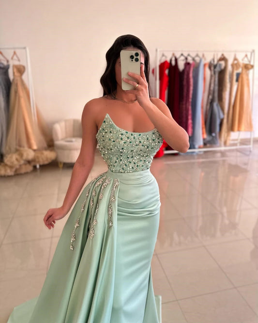 Strapless Satin Crystal Evening Dresses Mermaid Pleat Luxury Beading Sequin Formal Wedding Party Prom Gowns Vestido Customized