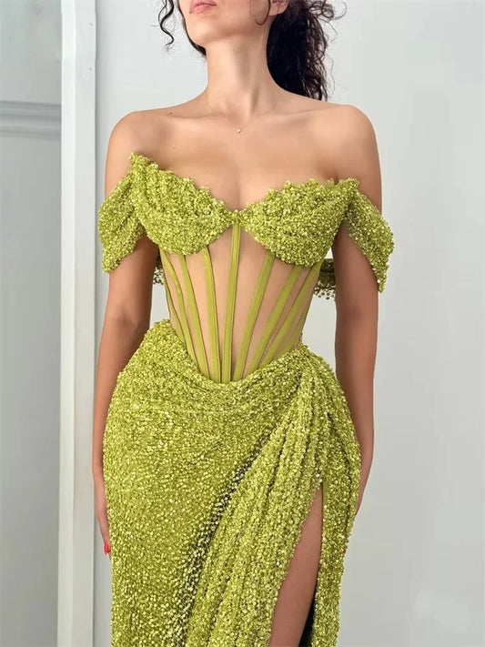 Sparkly Off Shoulder Prom Dresses Long with High Slit Mermaid Sequin Dress for Women Wedding Party Formal Gowns